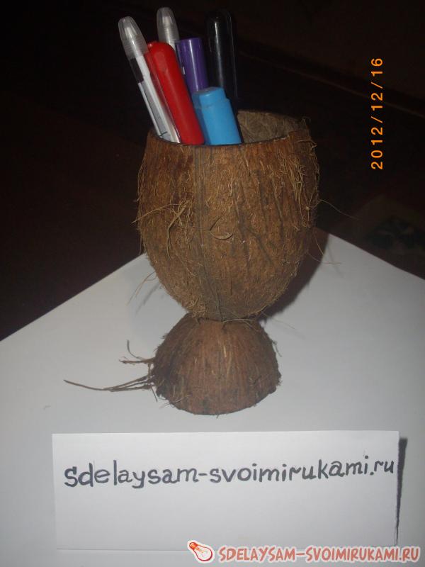Надеваем на болт верхнюю часть кокоса, одеваем со стороны подставки шайбу и плотно затягиваем гайку. По окончании данных нехитрых манипуляций должна получиться вот такая устойчивая, функциональная, а главное экзотическая подставочка для ручек.