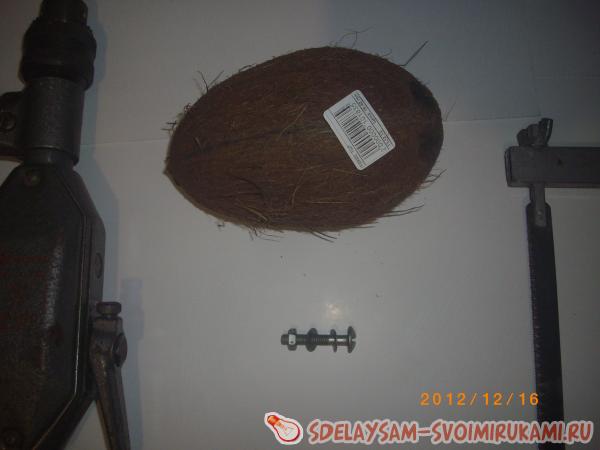 Для изготовления поделки потребуются: дрель ручная, ножовка по металлу, длинный болт и подходящая по диаметру гайка и две шайбы, и собственно сам кокос.