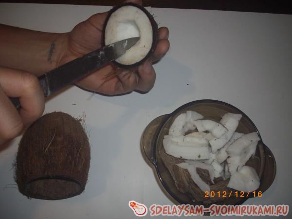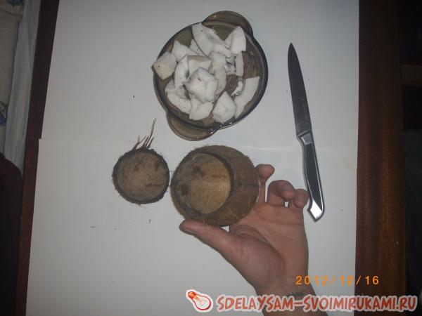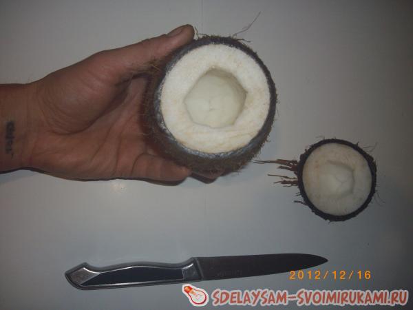 Отпиливаем третью часть, верхушку кокоса и обычным кухонным ножом удаляем мякоть кокоса.