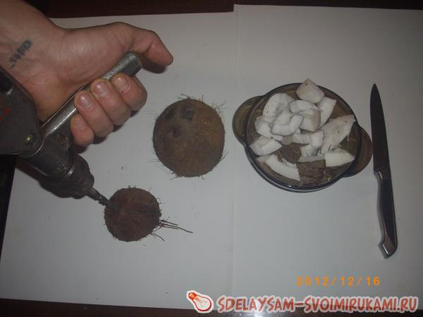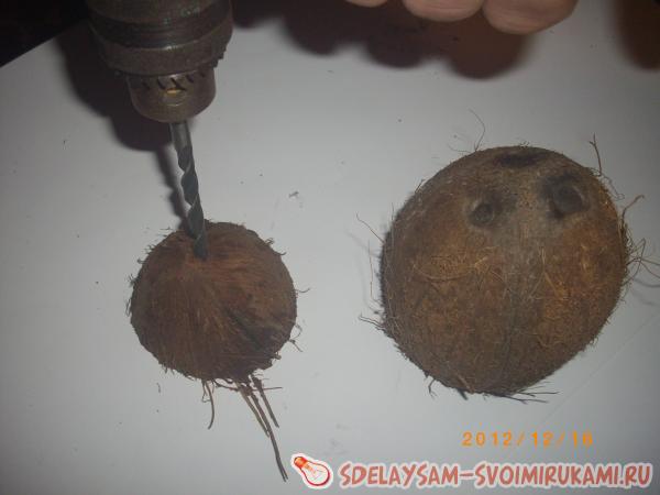 Прежде чем приступить к работе, нужно вылить содержащуюся в плоде жидкость. Сверху кокоса имеются 3 углубления, в них нужно проделать дырочки и вылить кокосовое молочко, без вскрытия всего ореха.