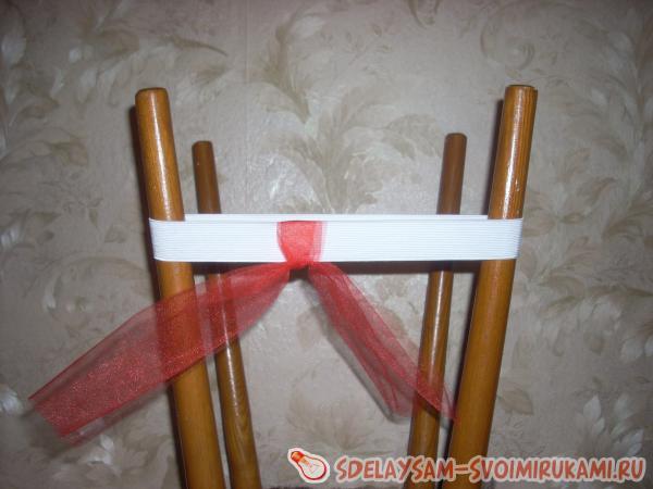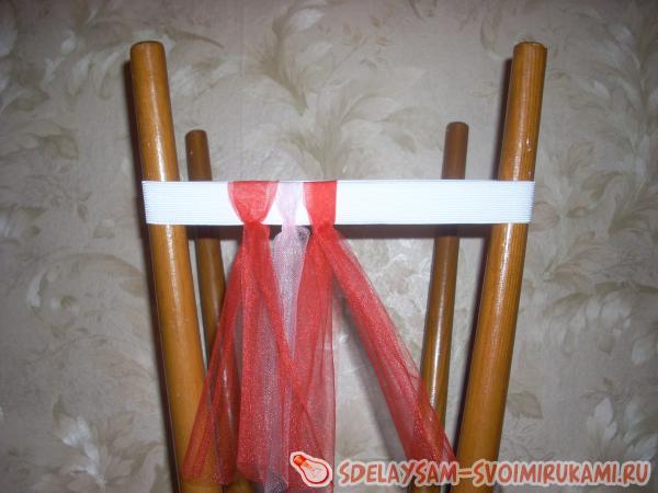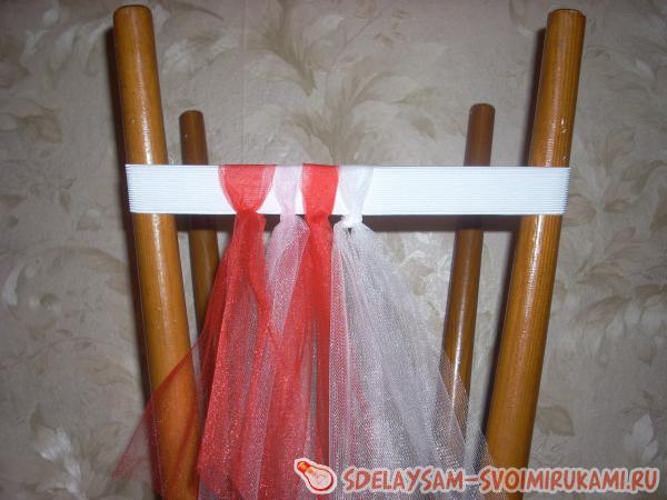 3. Берем полосу красного фатина и завязываем ее на резинке (резинка ни в коем случае не должна быть перетянута, иначе при носке она будет складываться и перекручиваться).