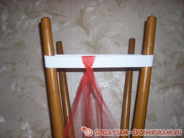 7. Снимаем юбку с ножек стула и равномерно расправляем все полосы фатина по резинке.