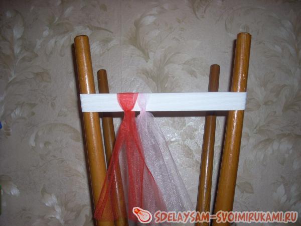 5. Таким способом завязываем все последующие полоски фатина, чередуя цветные полосы с белыми, для создания нужного рисунка. Для данной юбки полосы фатина брались в следующей последовательности: