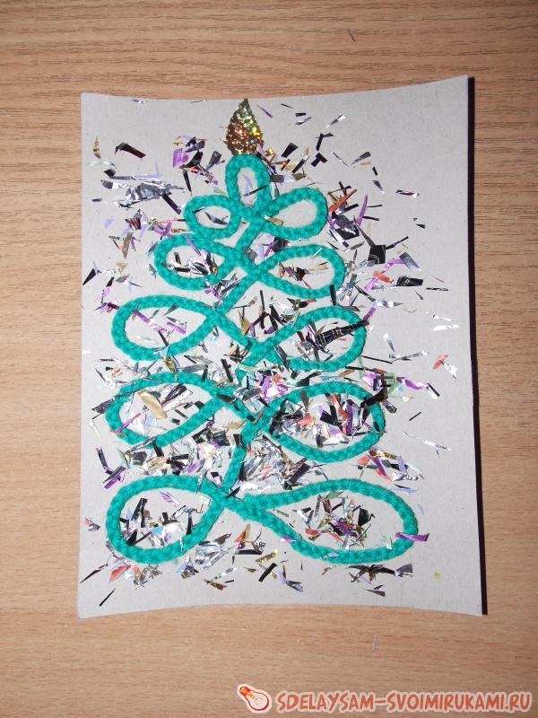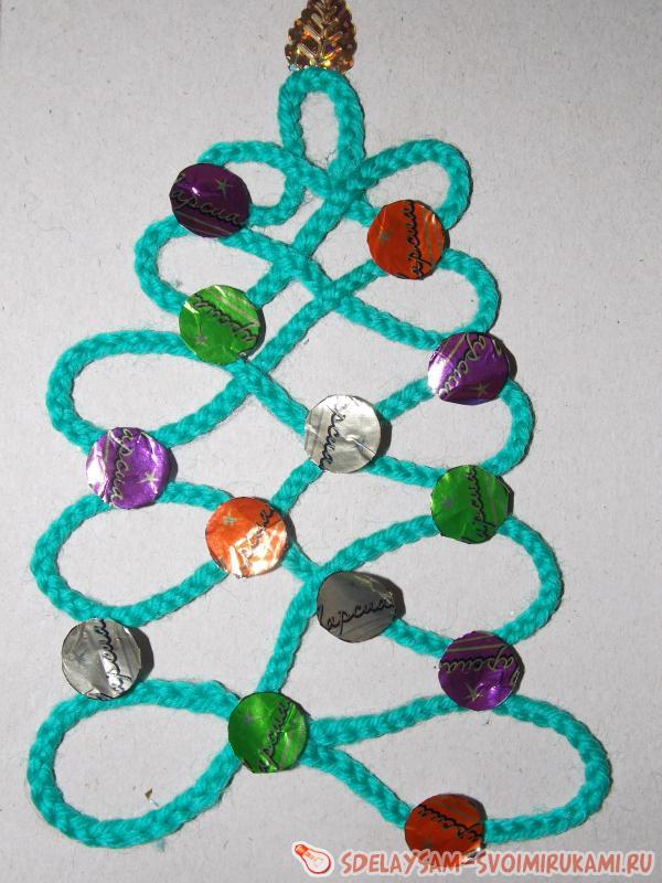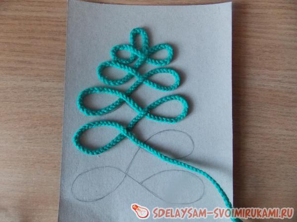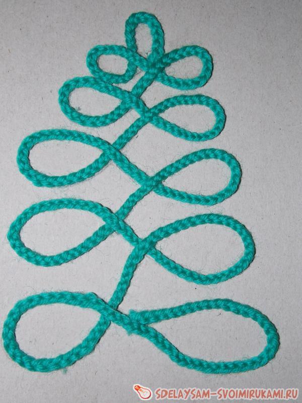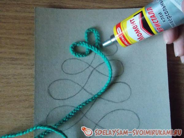3. Наносим по контуру тонкий слой клея и сразу приклеиваем сплетенную из пряжи косичку строго по линии. Елочка готова.