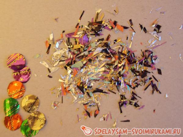 4. Из фантиков вырезаем кружочки диаметром не более сантиметра. Фольгу, часть фантиков, пайетки измельчаем.