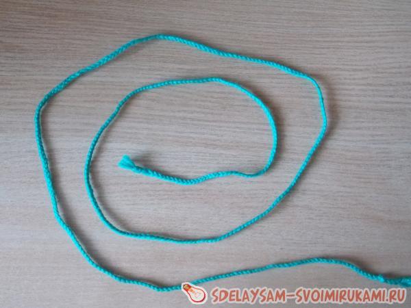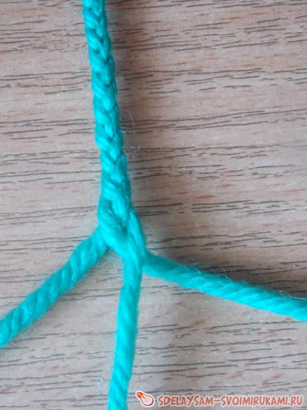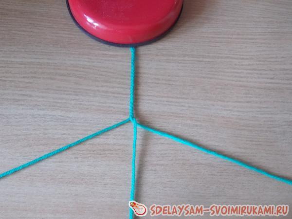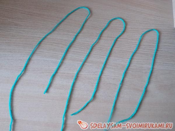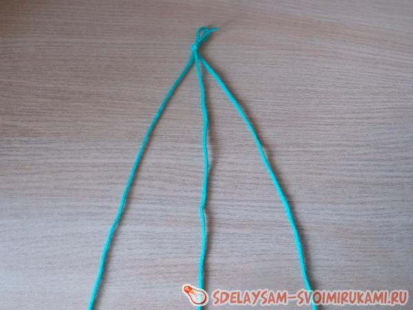 1. Готовим 3 нити пряжи длиной по 130 - 150 сантиметров. Один конец всех трех нитей завязываем в скромненький узелок. Подкладываем узелок подо что-то тяжелое для фиксации (например, лампу настольную), и плетем косичку. В конце косички опять делаем узелок.
