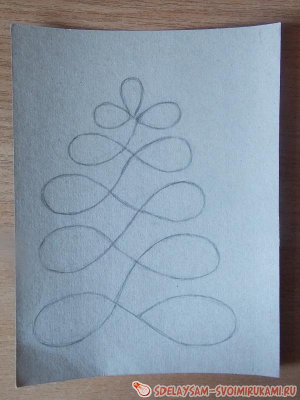 2. Берем лист картона, вырисовываем контур будущей елочки простым карандашом.