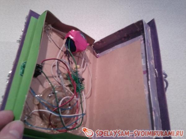 Подарок сделан племяннику на новый год и содержит голосовое поздравление. Конструкция исполнена в виде книги. Лента, которая держит книгу в закрытом состоянии, завязана на пуговичке. Развязав ленту, мы открываем книгу, и отжимается квадратная кнопка, которая видна на рисунке.