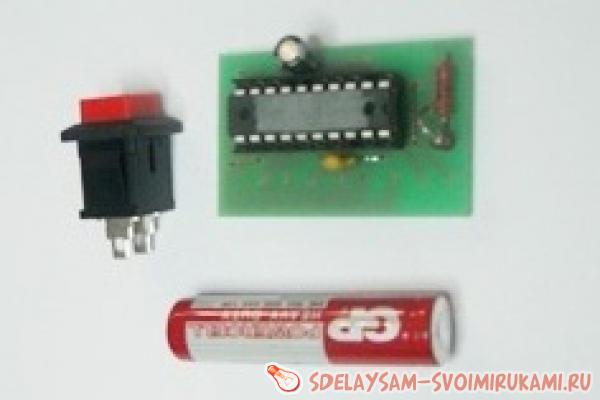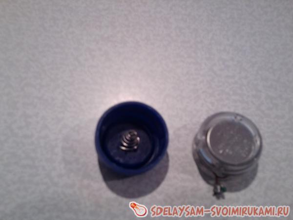 Схема достаточно простая, под силу любому начинающему радиолюбителю. Для сборки устройства понадобятся, кроме самой звуковой микросхемы, динамик мощностью 0,5 Вт и сопротивлением 8 Ом, нормально замкнутая кнопка (такая, контакты которой размыкаются при нажатии), два транзистора КТ315, четыре светодиода разных цветов свечения, два элемента питания GR2035 или любые другие с суммарным напряжением 6В, гнездо для элементов питания и немного монтажного провода. Гнездо питания для этого изделия, за не имением готового, было сделано из горлышка пластиковой бутылки. В дно пробки установлена пружина от старого пульта, а резьбовая часть горлышка с одной стороны закрыта сеткой из медной проволоки, которая и является вторым электродом.