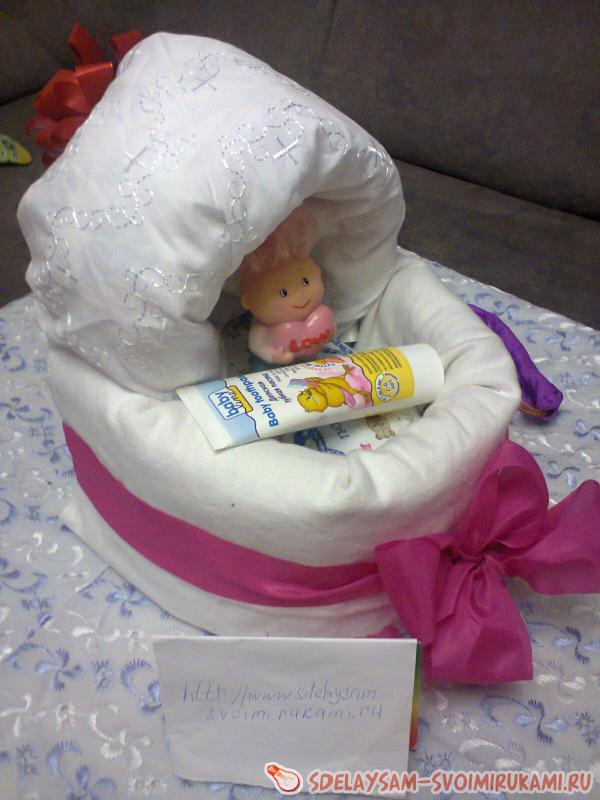 5. Переходим к изготовлению капюшона. Для этого вырезаем полоску картона, сгибаем ее виде дуги и вставляем между стен коляски и днищем. Накидываем на картонную полоску подгузники и драпируем все кофточкой или распашонкой, закрепляя ее английскими булавками.