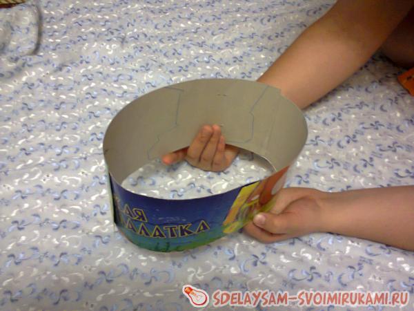 6. Делаем ручку коляски. Для ручки нам понадобится полоска картона, плотно обмотанная лентой, которая вставляется между стен коляски и днищем.