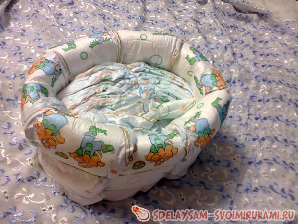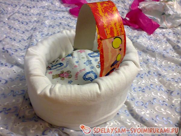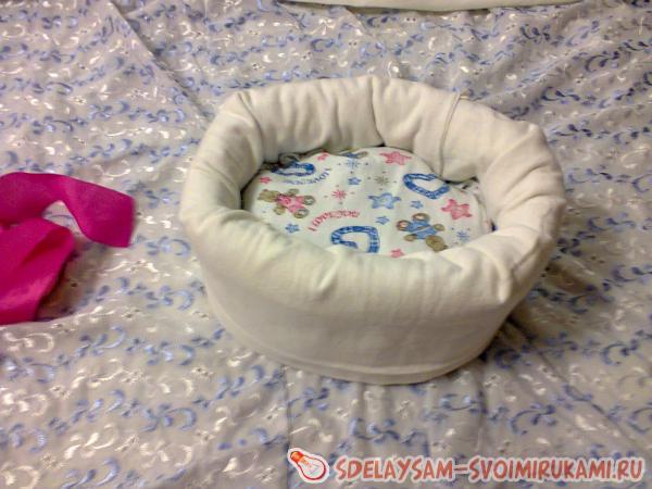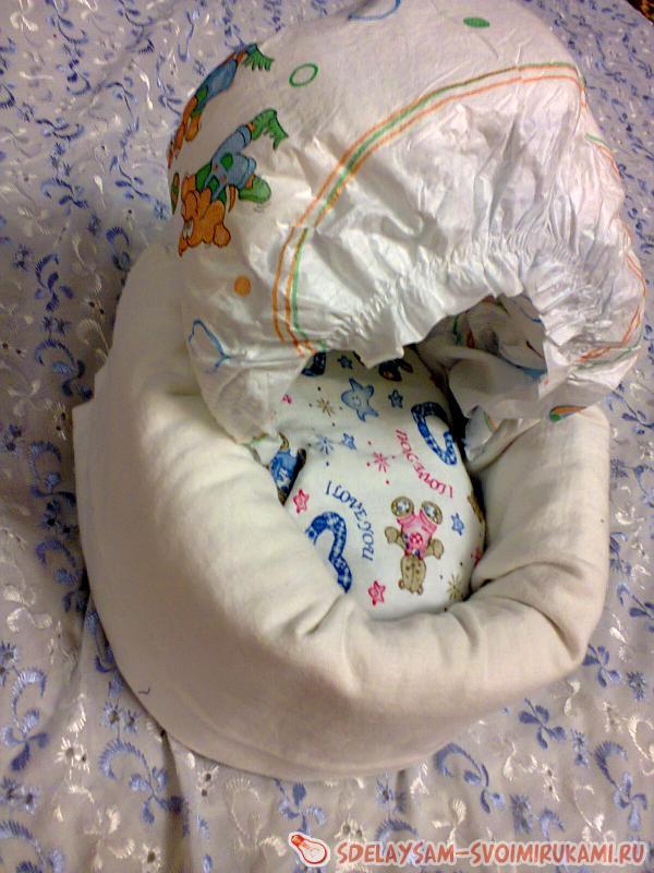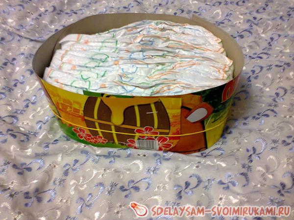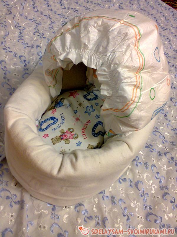 2. Обкладываем подгузниками картонную заготовку, как показано на рисунке. Вовнутрь овала вставляем подгузники, так чтобы образовалось плотное дно.