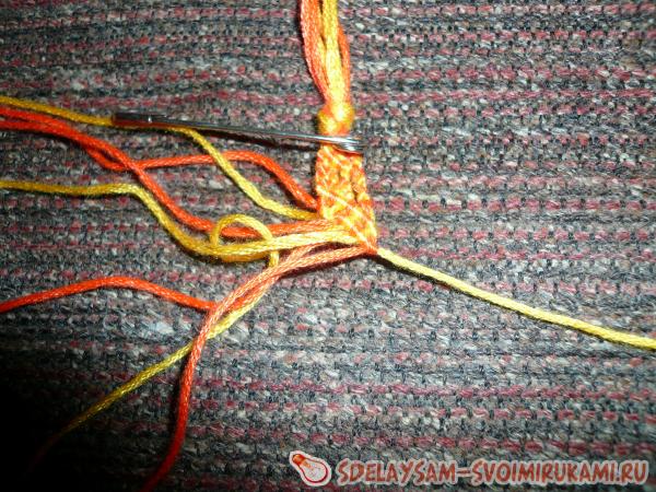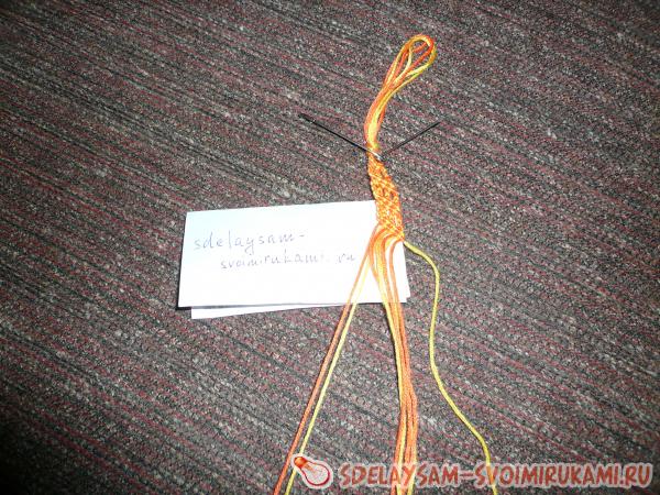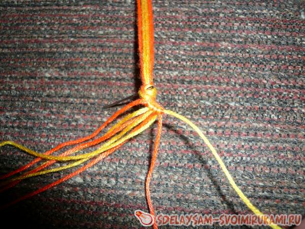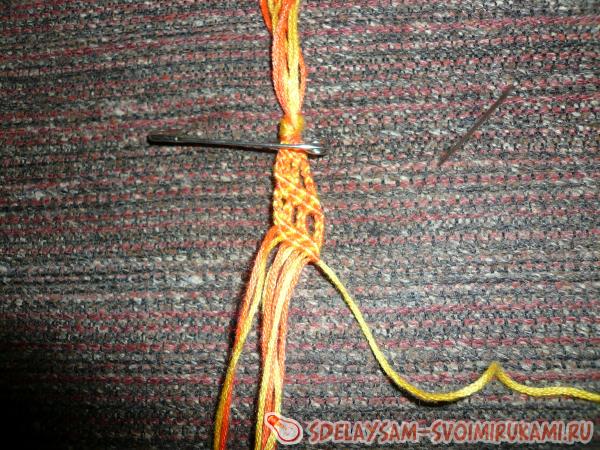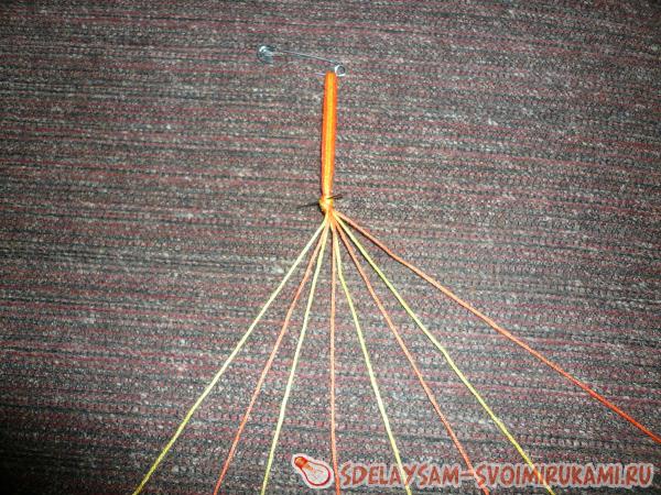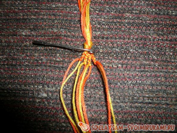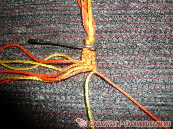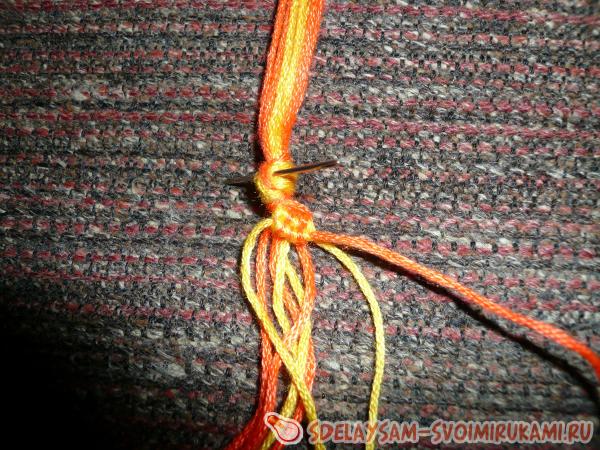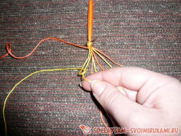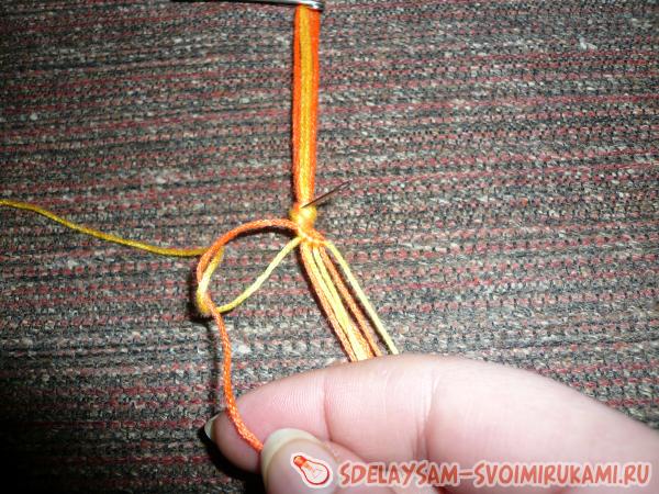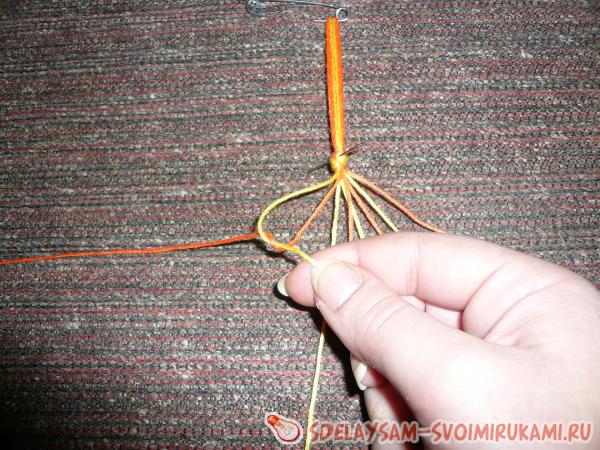 То есть, как бы завязываем узелок на первой нитке, а потом повторяем его. Далее на ту же самую нитку дважды завязываем узелок из следующей, ещё не задействованной, нитки и т.д. до тех пор пока все нитки не будут обвязаны вокруг первой.