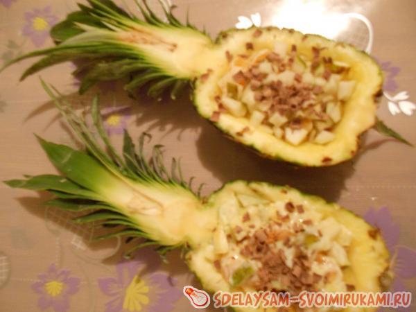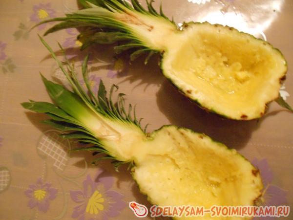 Аккуратно разрежьте ананас по горизонтали. Придется приложить не мало усилий, но это того стоит. Зелёный хвостик ананаса срезать не надо. Далее возьмите столовую ложку или нож с широким лезвием и удалите мякоть. Две «лодочки» послужат оригинальными салатниками.