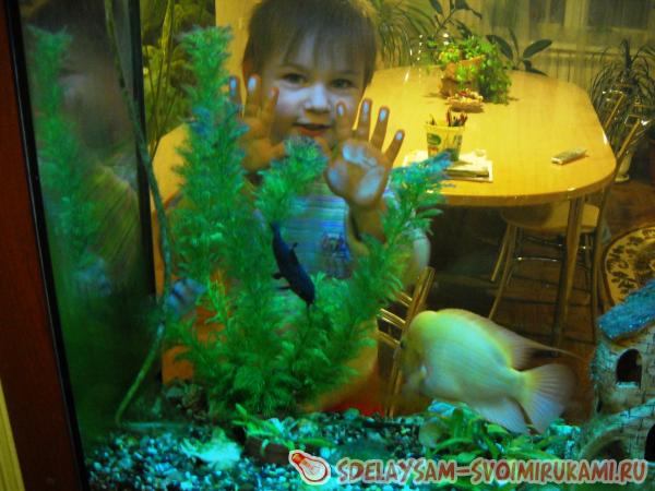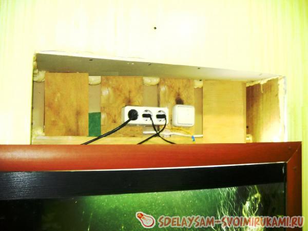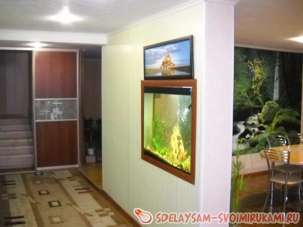 Передо мной встала задача – обеспечение чистки и подведения электричества к аквариуму. Так как мне хотелось интегрировать водоем в стену со стороны коридора и кухни, то я решил со стороны коридора оставить доступ для чистки, подключения электроприборов и кормления рыб.