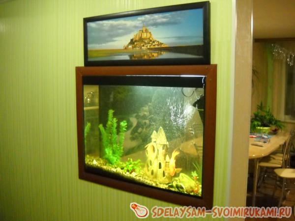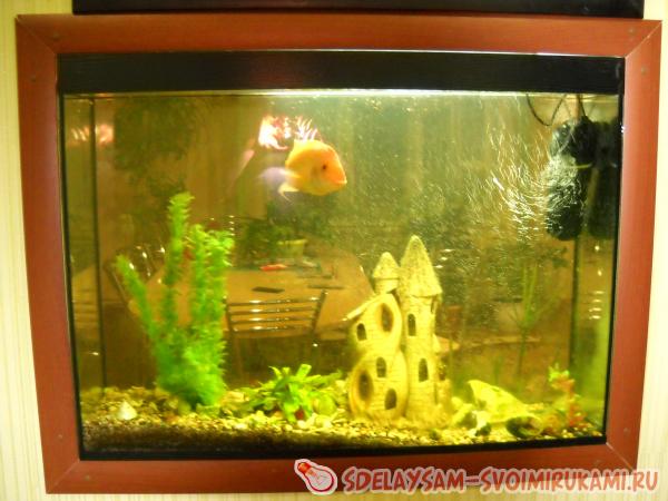 Рядом с нишей я использовал не обычный профиль из металла, а обрезную доску, после чего обкрутил полученный проем ДСП. Обращаю внимание, что место, где устанавливается аквариум, должно быть надежно обустроено, для усиления я использовал сплошное обрешетку доской стен под дном аквариума. Нижний кусок ДСП следует проверить уровнем, а сбоку лучше оставить зазоры около сантиметра. Для надежности и во избежание изломов от прогиба основания, при установке аквариума, я подложил под его дно пенопласт от потолочных панелей, толщиной около сантиметра. Воду аккуратно заливал с помощью шланга, постоянно следя за смещением корпуса аквариума.