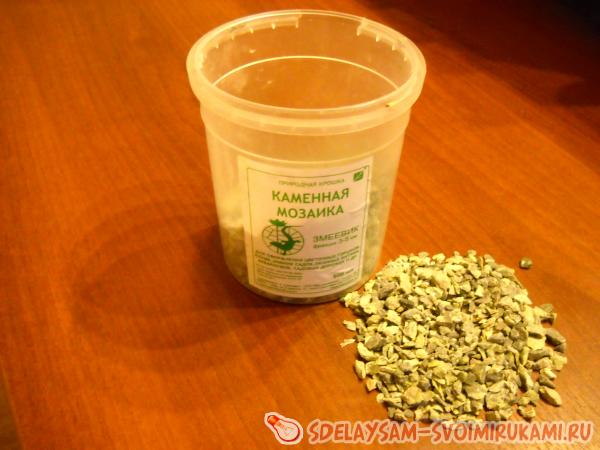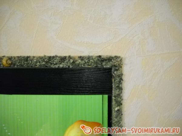 Гипсокартон обклеивали обоями, поэтому имеющуюся щель между корпусом и стеной я заделал с помощью обычного пластикового уголка. На угол наклеил декоративную крошку из камня «Змеевик» и ракушки.