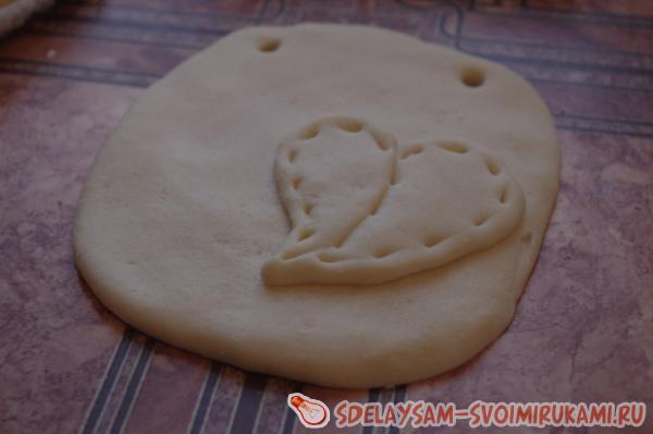 В первую очередь следует определиться с формой заготовки под панно. Придать нужную форму кусочку теста можно просто руками или при помощи скалки и ножа. Неровные края заглаживаем кисточкой, смоченной водой. После этого нужно не забыть об отверстиях под ленточку, которые можно проделать зубочисткой или другой стороной кисточки.