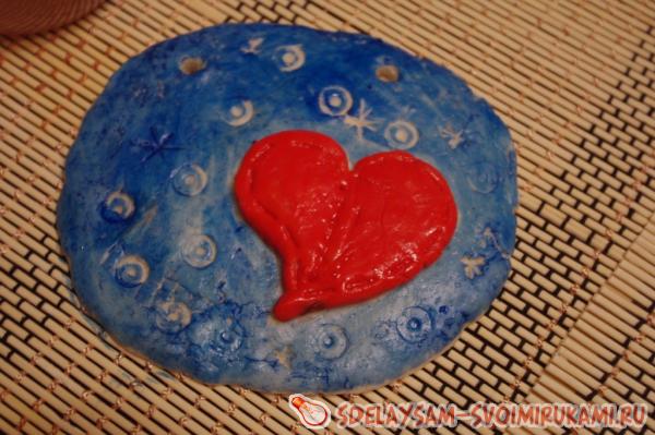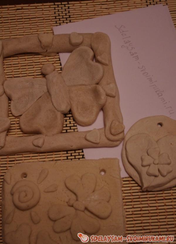 Затем сразу же переходим к декорированию. Узор можно наметить зубочисткой, отпечатками ткани на тесте или любыми интересными предметами: пуговицами, детскими печатями, бусинами. Сам сюжет нужно вылепить из небольших кусочков соленого теста. Мы выбрали бабочку и цветок, отдельные детали которых имеют форму сердечек. Прикрепить объемные фигурки на заготовку панно можно, опять используя кисточку.