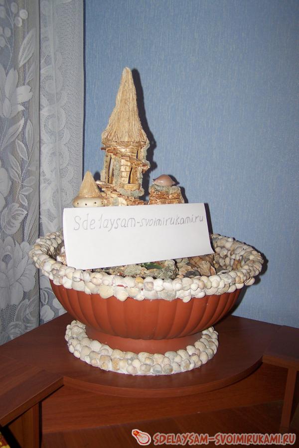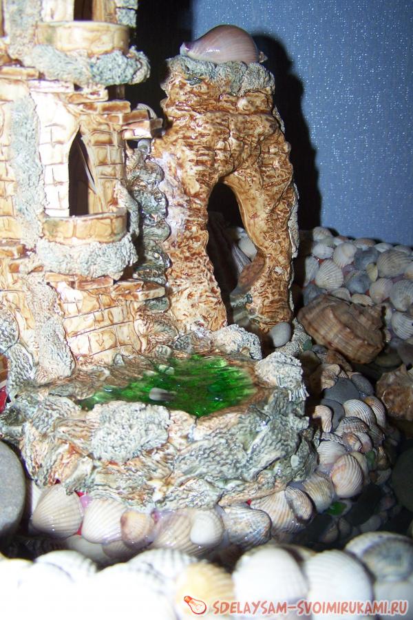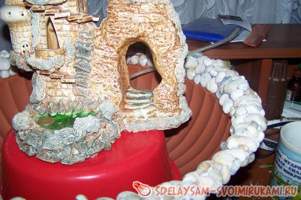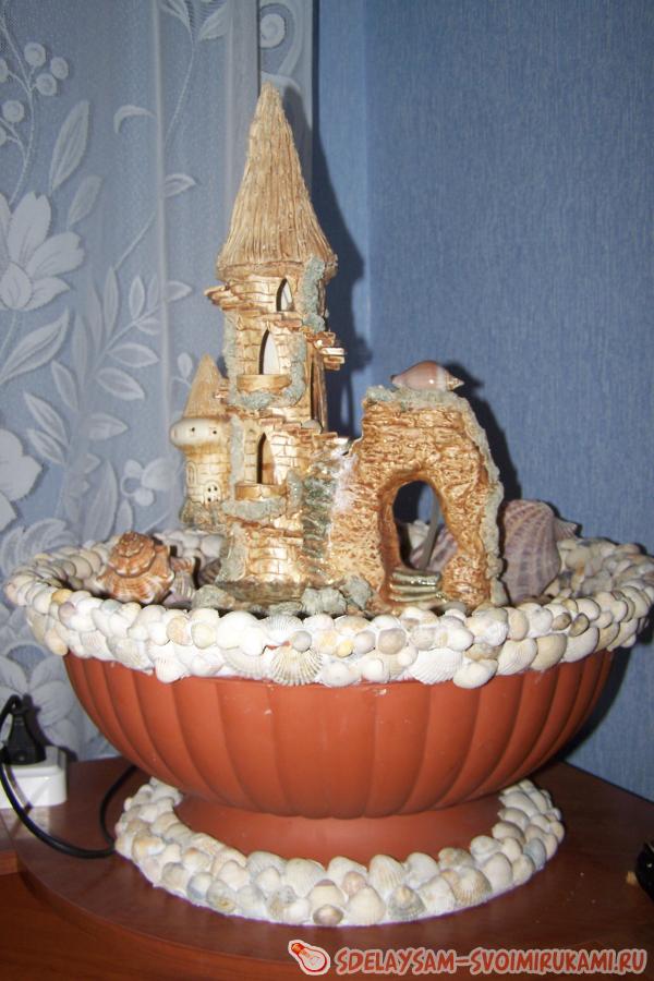 Продолжаем оклеивать ракушками и мелкими камешками поверхность маленькой емкости, и других видимых частей. Не стоит тратить лишнее время и силикон на поклейку мест, видимость которых будет закрыта большими камнями. Не забудьте хорошо замаскировать и приклеить прозрачную трубку, по которой будет поступать вода. После завершения всех работ с применением силикона и клея, дайте высохнуть изделию 24 часа. После окончательного высыхания клея пора расставить все камни и другие элементы украшений. Воду стоит заливать фильтрованную или дистиллированную, для исключения образования белых слоев соли на камнях. После завершения всех подготовительных работ включаем насос и радуемся появлению нового оригинального элемента интерьера в вашем доме.