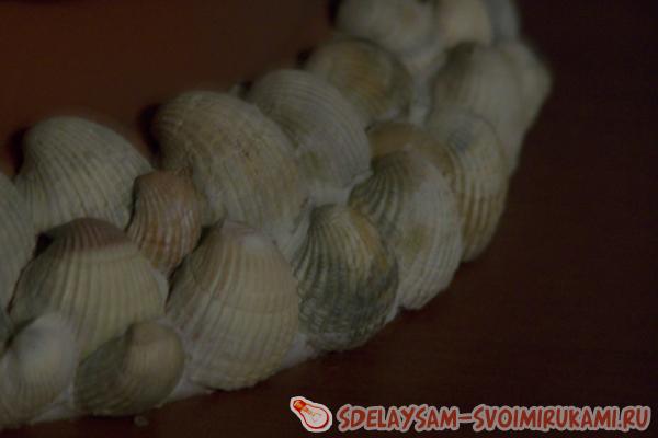 Первым делом стоит примерять основные компоненты. После удачного соблюдения размеров в процессе примерки, приступим к сборке и к склеиванию. Следует хорошо промыть обе емкости и обезжирить те части, на которые будут крепиться ракушки. Клеить ракушки стоит не спеша, двигаясь по всей окружности сверху в низ, начиная с верхней кромки декоративной емкости. Нужно полностью заполнять жидкими гвоздями всю полость ракушки, и только тогда прикреплять к поверхности стенки. Для поклейки внутренних стенок емкости ракушками нужно использовать силикон. Схему поклейки ракушек вы видите на фото.