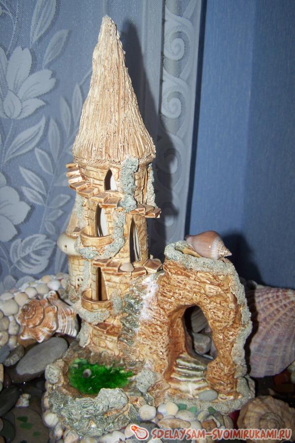 Посетите ряд хозяйственных и электротехнических магазинов, в которых вам потребуется купить множество разных товаров, таких как: декоративная пластмассовая емкость, ракушки, два тюбика белых (только белых) жидких гвоздей, один тюбик прозрачного силикона (желательно для душевых кабинок), фарфоровый или глиняный замок (со ступеньками или желобками, по которым будет стекать вода), специальный насос небольшой мощности и декоративные камни.