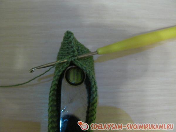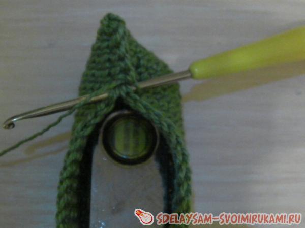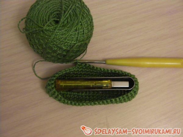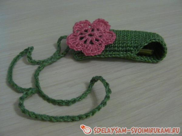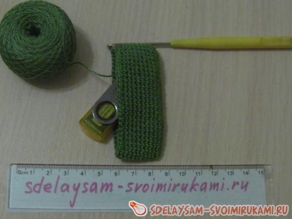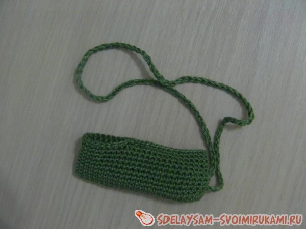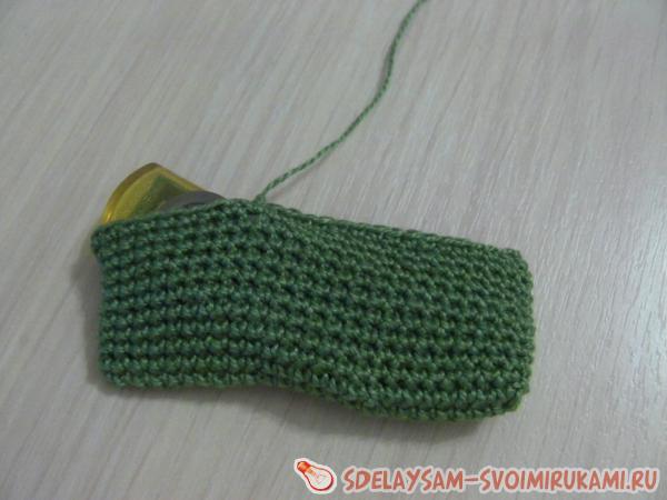 Соединительный ряд не довязываем до конца на 2 см – расстояние равное ширине флешки, чтобы она свободно входила и выходила из чехла. Нить проводим сквозь последнюю петлю и затягиваем. Нить перетягиваем крючком наизнанку, закрепляем и обрезаем конец.