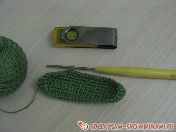 В последнюю петлю вяжем 3 столбика без накида. Приступаем ко второму ряду без подъемной воздушной петли. Теперь вяжем все время по кругу столбики без накида без прибавлений 11-12 рядов, чтобы флешка, помешенная внутрь, полностью скрывалась внутри.