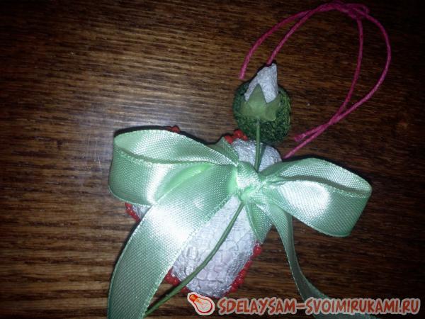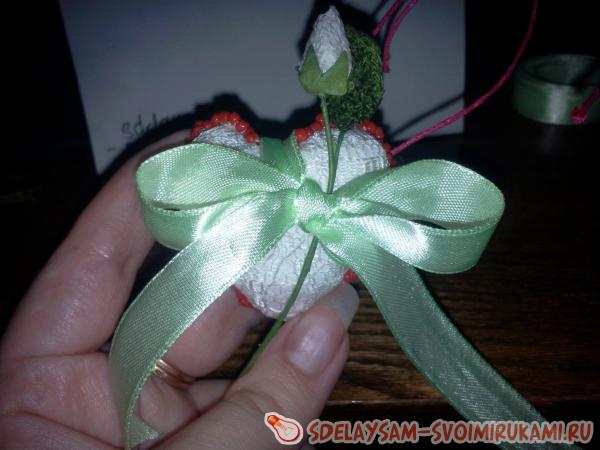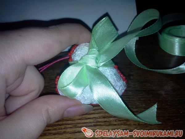 Затем отрезаем атласную ленточку зеленого цвета и завязываем на сердце бантик, в узел от банта нужно капнуть клея для ткани, чтобы бантик не развязывался. Не стоит моментально отрезать ленту, сначала примерьте ее, завяжите пробный бантик, а уж потом отрезайте «Семь раз отмерь, один раз отрежь…».