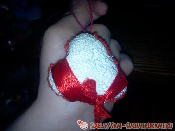 После того как сердце набито наполнителем, сшито и немного украшено бисером, нужно придать форму, для этого берем затянутую игру с шелковой нитью, и насквозь протыкаем сердце, туго затягивая нить, такие стяжки нужно делать пока сердце не обретет форму.