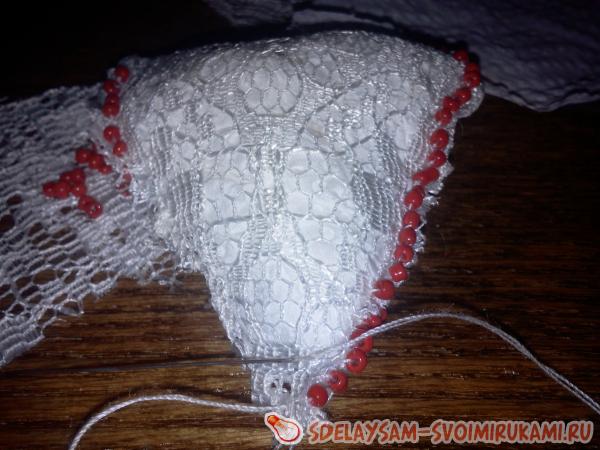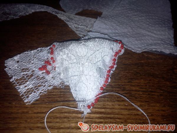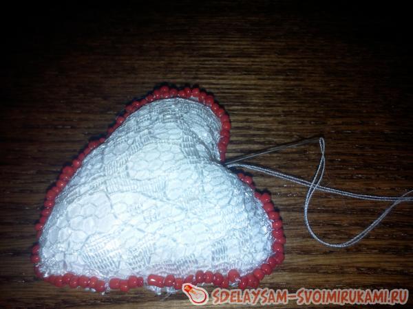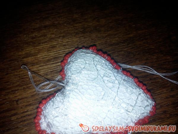 Сердце приняло округлую форму, стало плотным, но не очень красивым, стежки бисера редкие, нитки от кружевной ткани еще торчат в разные стороны.