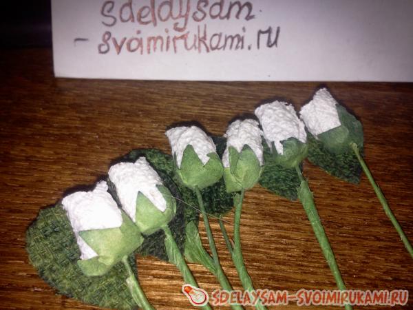 Берем фурнитуру, готовый бутон розы и вставляем его между сердцем и бантиком, для закрепления можно сделать несколько стежков шелковой нитью или капнуть клея, в нашем случаи лента завязана туго и бутон не выпадает.