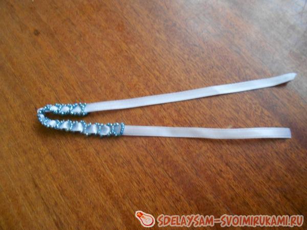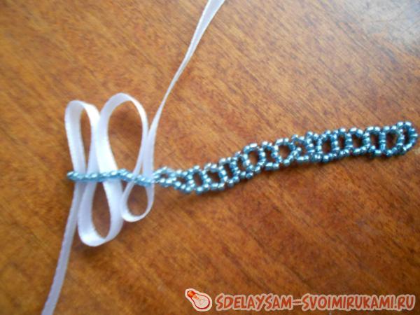 Вы уже подготовили бисер, ленту и иголку с ниткой? Тогда начинайте плести простую бисерную цепочку (плетется на две нити). Нанижите на нить десять бисеринок, пройдите вторым концом нити через три последние бисеринки, замкнув нить в кольцо, теперь на одну нить нанижите две бисеринки, на другую пять, и пройдите первой нитью через три последние бисерины на второй нити. Получится второй колечко, таким способом сплетите цепочку необходимой длины.