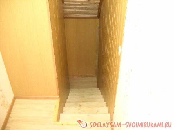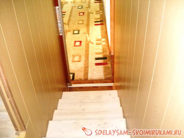 Для безопасности лестницы и ее прочности вместо ограждения я предусмотрел сплошную стену между маршами. Всю отделку над лестничным маршем произвел панелями МДФ, так как учел, что при схождении по лестнице стены приходится задевать, а из этого материала их достаточно протирать.