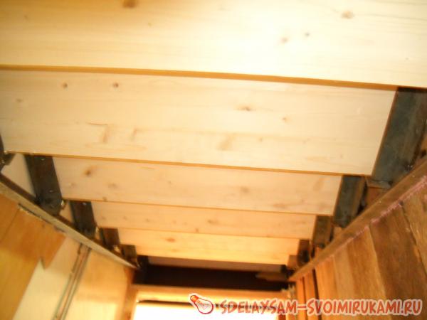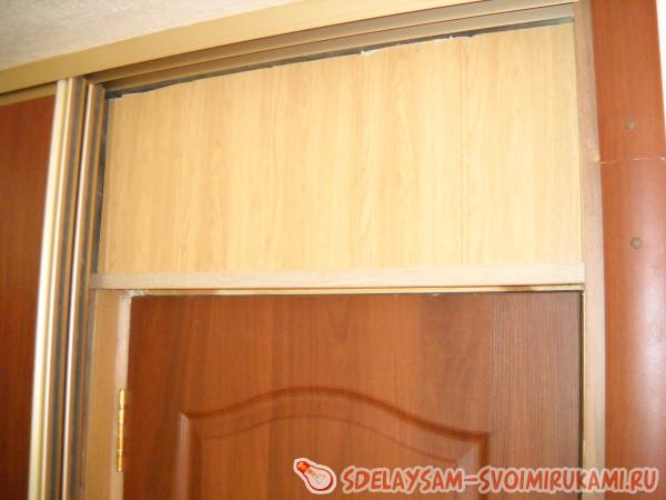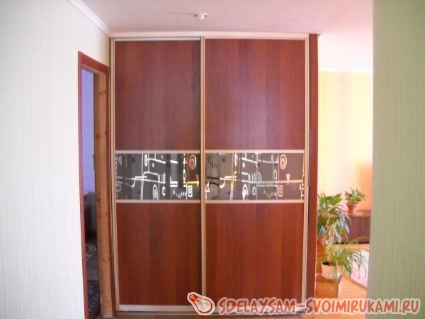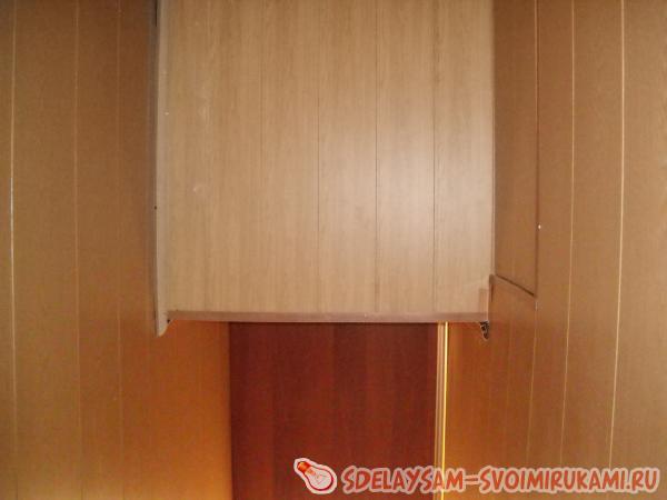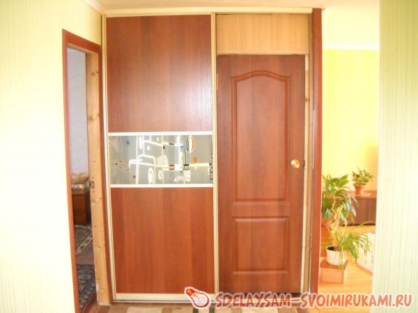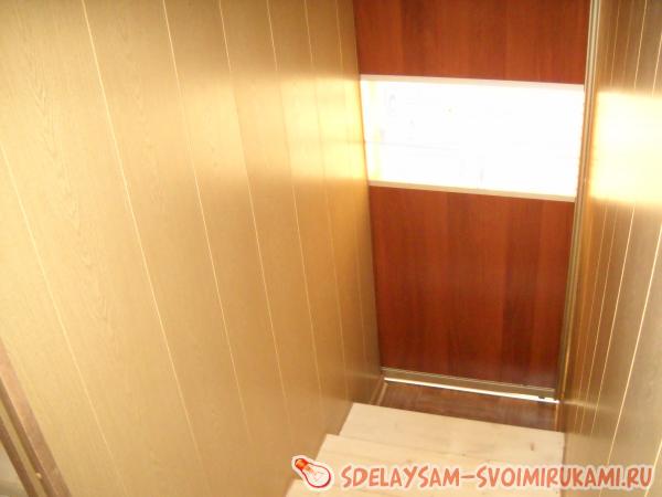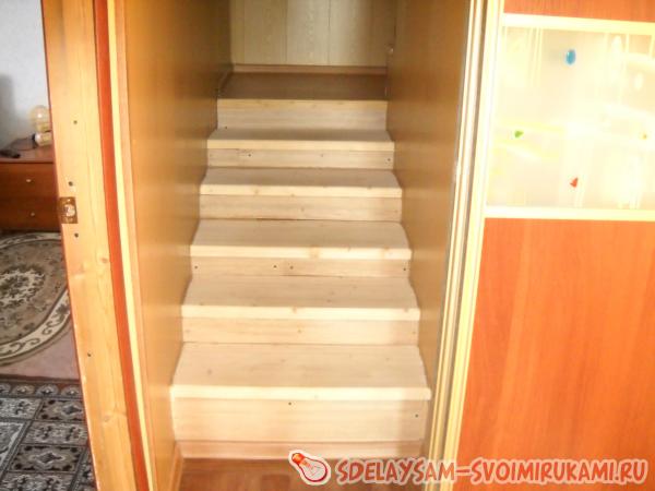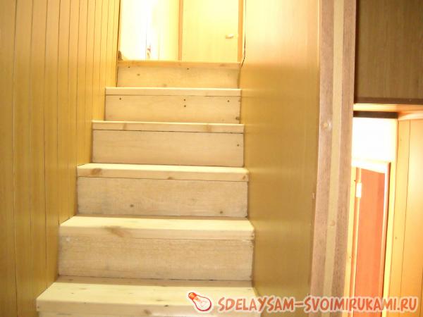 Стены коридора у меня изготовлены с трех сторон из деревянных конструкций, поэтому я решил изготовить лестницу без балясин и замаскировать ее под шкаф, используя в качестве дверей механизм купе.