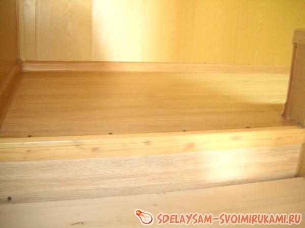 Для двухмаршевой лестницы изготовил посередине площадку, закрепив к стенам 40 миллиметровые уголки, положив на них старую деревянную дверь. Сверху дополнительно чтобы выровнять поверхность и придать большую прочность площадке, прикрутил лист ДСП шириной 90 сантиметров. В дальнейшем облицевал поверхность ламинированным паркетом, а переходы прикрыл декоративным уголком.