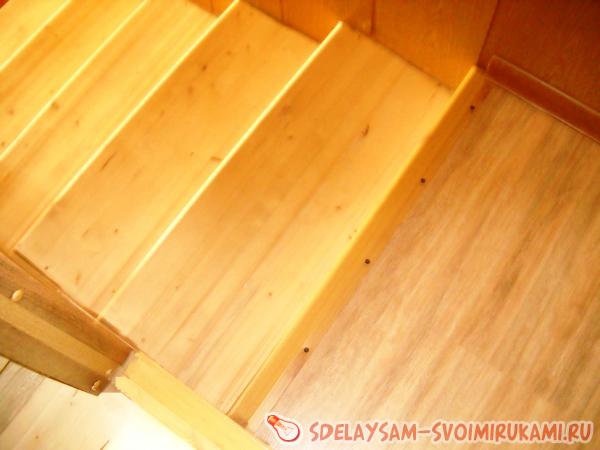 Крепление ступеней нижнего марша произвел саморезами по краю, а верхнего изнутри в заготовленные в металлическом уголке отверстия.