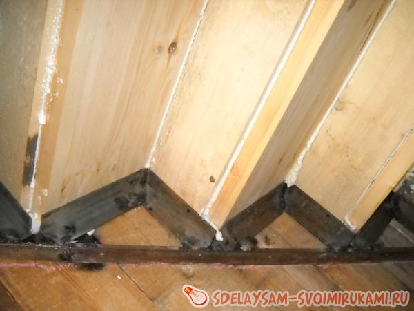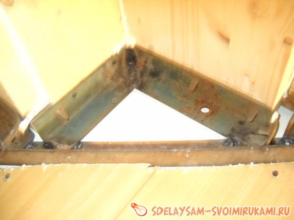 Косоур нижнего марша я выполнил из бруса толщиной 60 миллиметров и шириной 30-35 сантиметров. Тетиву под косоур изготовил из уголка заранее насверлив в нем отверстия через каждые 10 сантиметров с двух сторон, для крепления косоура и к стене. Этот уголок в связке с другими металлоконструкциями послужил несущим каркасом лестницы. Все основание верхнего марша изготовил также из уголка, который заранее напилил углошлифовальной машиной и сварил на улице. В качестве донора уголка использовал три старые кровати с панцирной сеткой.