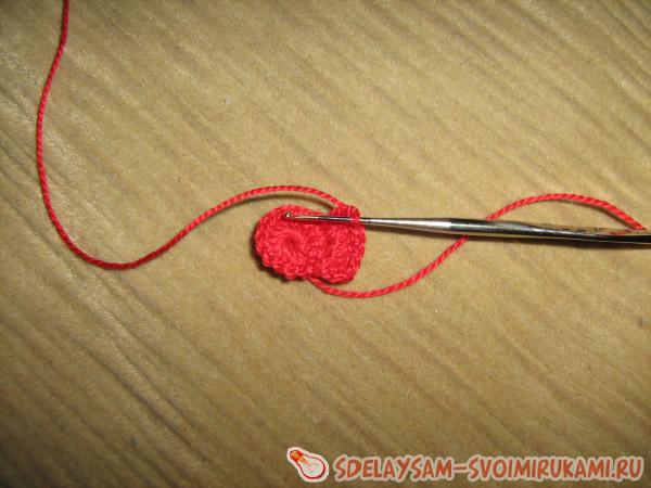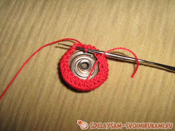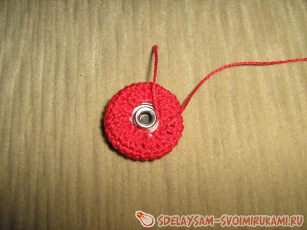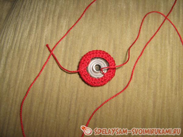 Сначала обвязываем пуговицу красными нитками. Для этого набираем 3-4 в.п. и замыкаем в круг.
