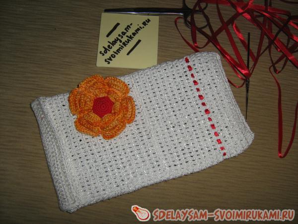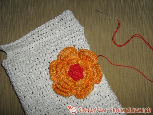 Пришиваем пуговицу к цветку, а цветок к чехлу. Чтобы с изнаночной стороны не было видно ниток, цветок надо пришивать к верхним ниткам полотна.