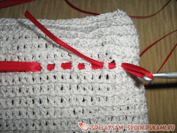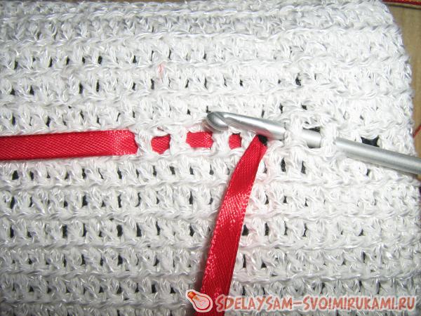 4. Декорируем чехол атласной ленточкой! Вдеваем ее так, как показано на фотографии. Сшиваем концы.