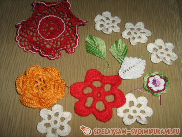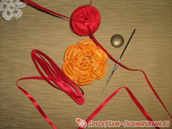 В данном случае использован оранжевый цветок, связанные из ниток ирис (желтый цвет и оранжевый меланж), пуговица, обвязанная красными нитками ирис и красная атласная ленточка.