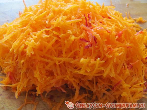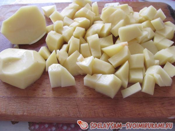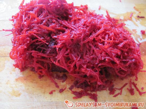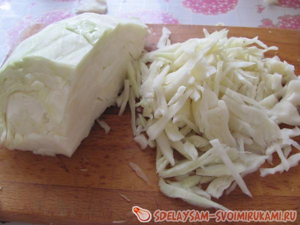 Картофель нарежем небольшими кубиками и отправим их в кипящий бульон. Следом за ним, добавим в бульон капусту, нарезанную тонкой соломкой. В то же время очистим все овощи, хорошенько предварительно промыв их водой. Нарежем мелко лук и начнем пассеровать его на среднем огне в разогретой сковороде с добавлением растительного масла. Измельчим на мелкой терке морковь и свеклу, добавив их к луку.