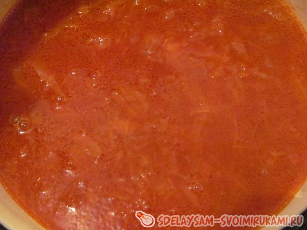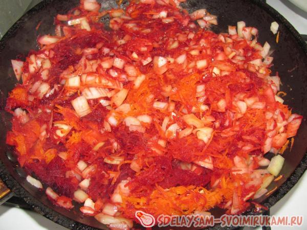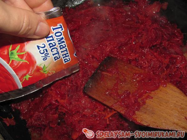 Помешивая, будем пассеровать овощи минут 10, после чего, вольем в них томатную пасту, а также посолим и подсахарим по вкусу. Минут через 5 наша овощная заправка к борщу будет готова. Теперь ее можно смело добавить к бульону с картофелем и капустой. Через минут 15 – 20 наше блюдо уже можно назвать будет готовым борщом и приглашать всех обедать.