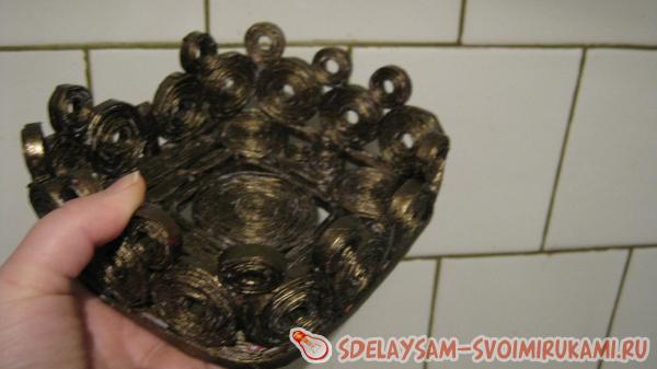 5. Теперь, когда у меня есть уже готовая основа вазочки для конфет, можно приступать к формованию ее стенок. Самым простым вариантом будет накрутить круглых заготовок, разных размеров. Напоминаю, я их крутила на шариковую ручку, каждый виток промазывала клеем. Если вы в дальнейшем будете украшать вазочку стразами, то лучше накручивать на тонкую основу, чтобы отверстие было маленьким, т.к. потом некуда будет намазывать клей или нужно будет выбирать декоративные элементы побольше.