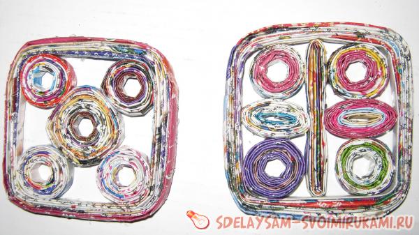 3. Кладу в центр форму-заготовку, с четырех сторон приклеиваю круглые заготовки. Даю возможность клею просохнуть, чтобы в дальнейшем, когда будут фиксироваться заготовки, они оставались на своих местах. Если в вашем варианте вазочки есть пустоты, их можно заполнить, накрутив кружочков или овалов, их тоже необходимо приклеить.