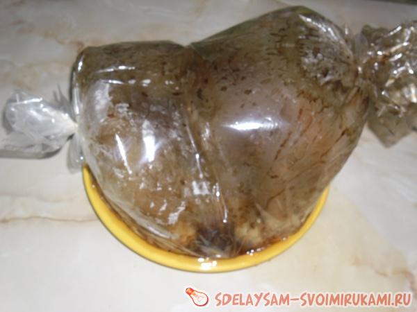 Защипните и вторую сторону рукава и отправьте томиться в духовку. До полной готовности необходимо будет подождать не менее часа.