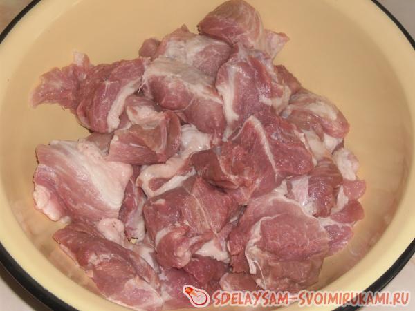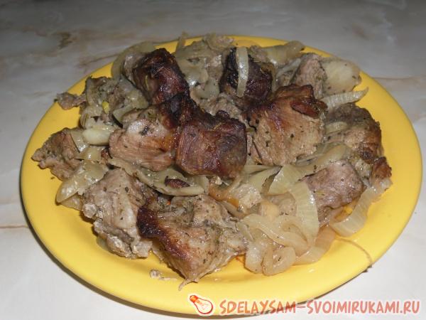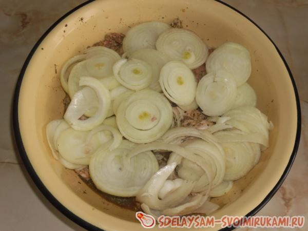 Пока мясо немного впитывает приправы, лук порежьте на кольца. Добавляйте его к мясу.