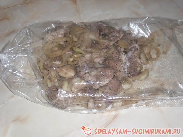 Если появилось возможность пожарить шашлыки на свежем воздухе – отлично. Если нет, приготовьте дома. Это можно сделать разными техниками: пожарить на сковороде, приготовить в аэрогриле. Очень вкусно получается, если запекать в рукаве. Приготовьте рукав необходимой длины. Защипните с одной стороны рукав, поместите туда подготовленное мясо.