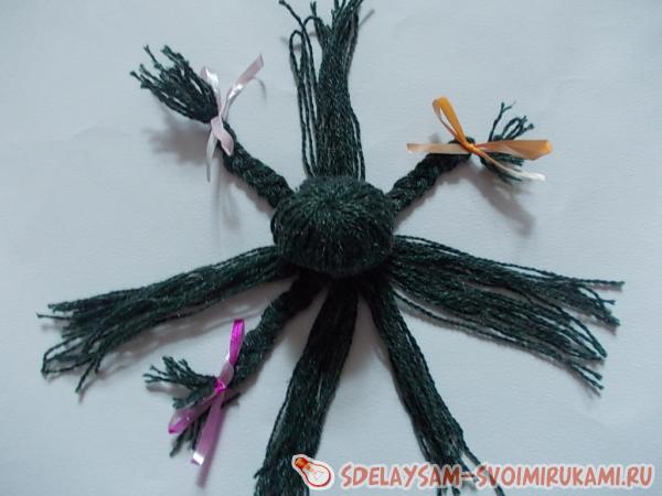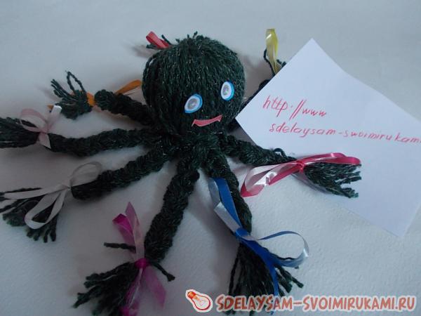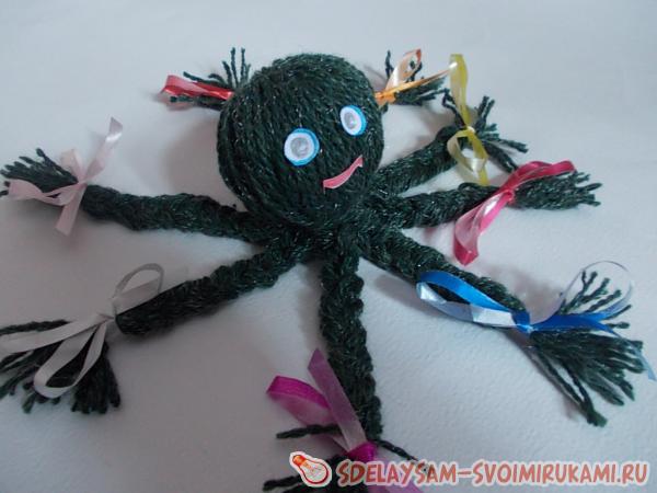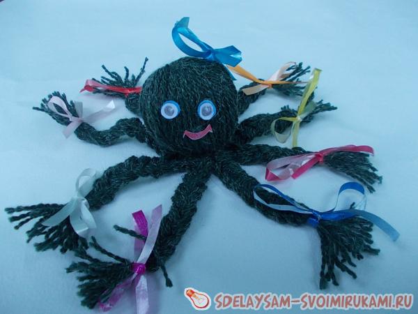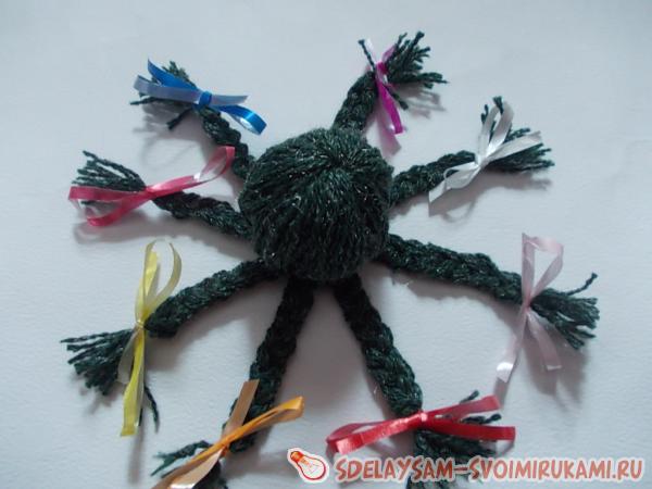 6. Самое интересное: делим нити на 8 ровных прядей и плетем косички-щупальца, на кончиках завязываем небольшие бантики. Если это будет осьминог-мужчина и бантики вы сочтете неуместными, можно просто ленточки обрезать покороче и завязать скромным узлом. После того, как щупальца выполнены – последний штрих: нужно ножницами аккуратно подравнять нити на кончиках косичек.